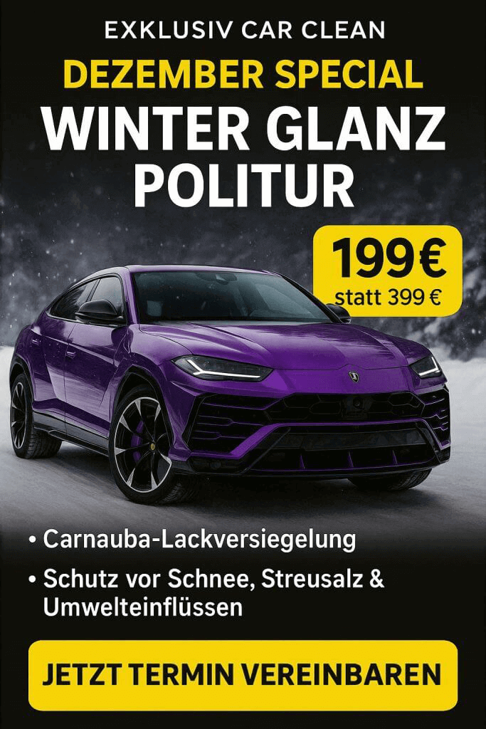 Im Dezember bieten wir bei Exklusiv Car Clean unser besonderes „Winter Glanz Politur“-Special an: Für nur 199 € statt 399 € erhältst du eine intensive Außenbehandlung inklusive Hochglanzpolitur und Carnauba-Lackversiegelung – perfekt, um dein Fahrzeug optimal auf den Winter vorzubereiten.