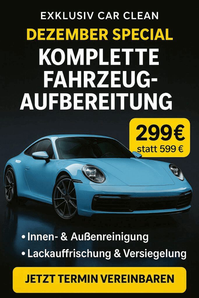 Im Dezember bieten wir bei Exklusiv Car Clean unser stark reduziertes „Komplette Fahrzeugaufbereitung“-Special an: Für nur 299 € statt 599 € erhält dein Fahrzeug eine intensive Innen- und Außenaufbereitung inklusive Lackauffrischung und hochwertiger Versiegelung.